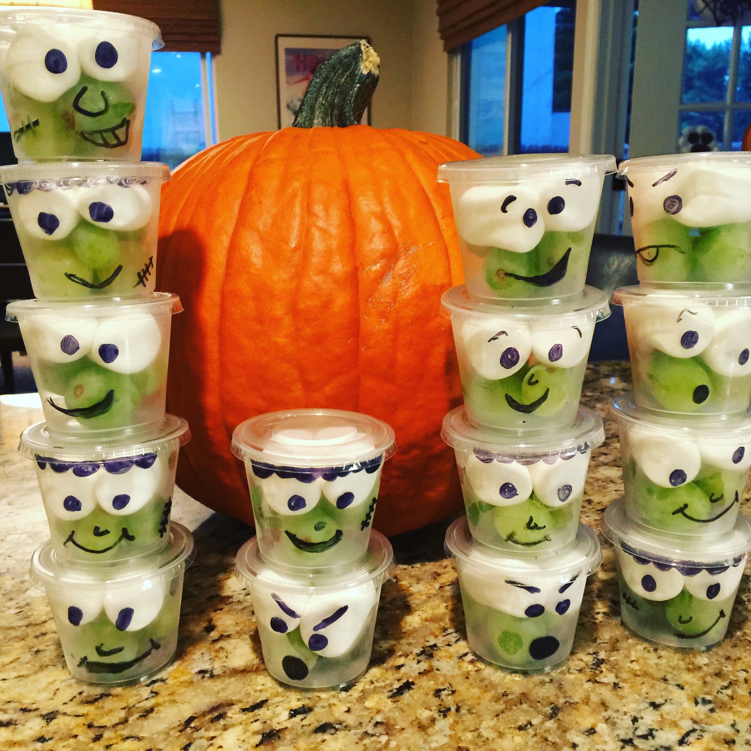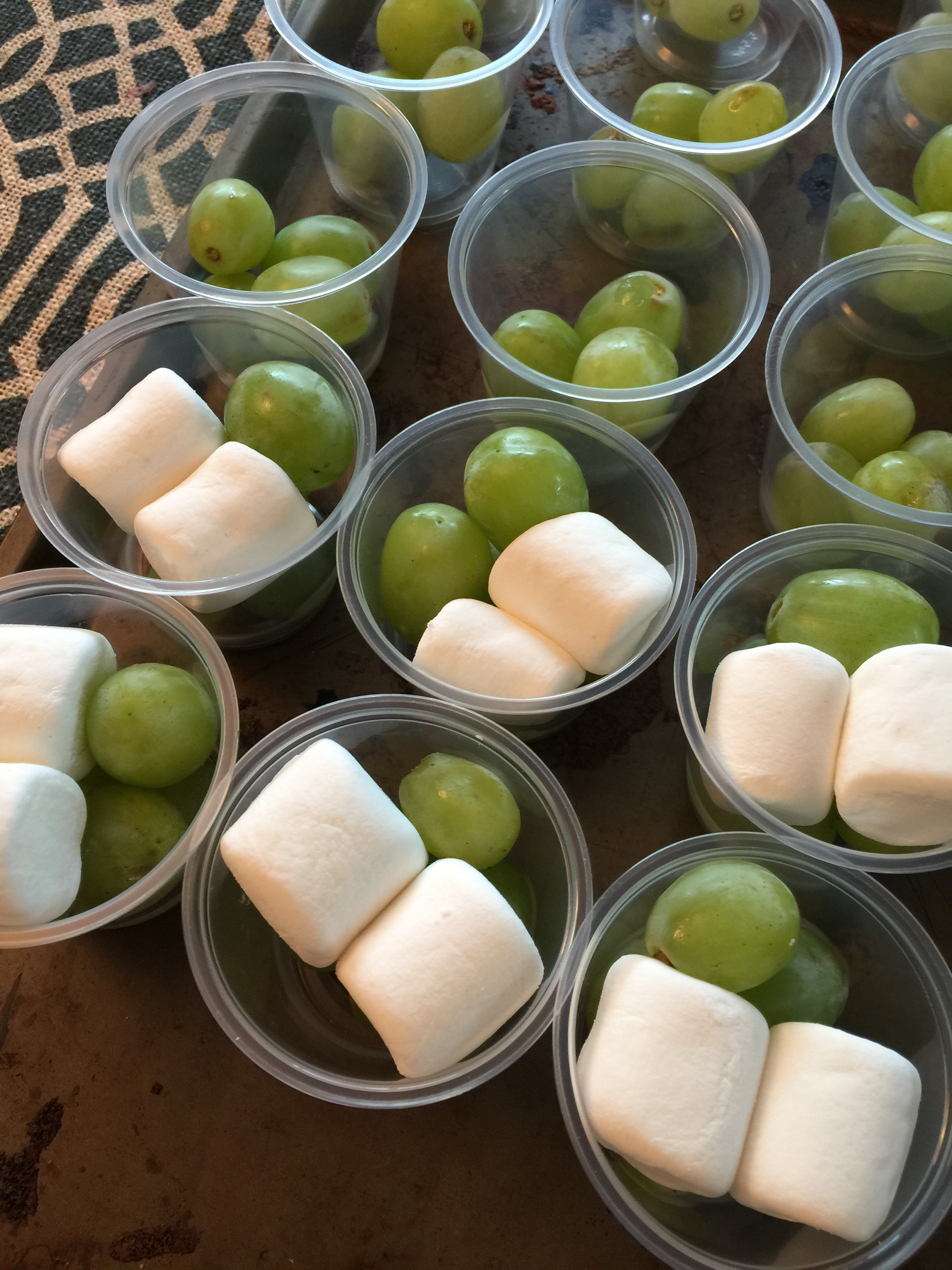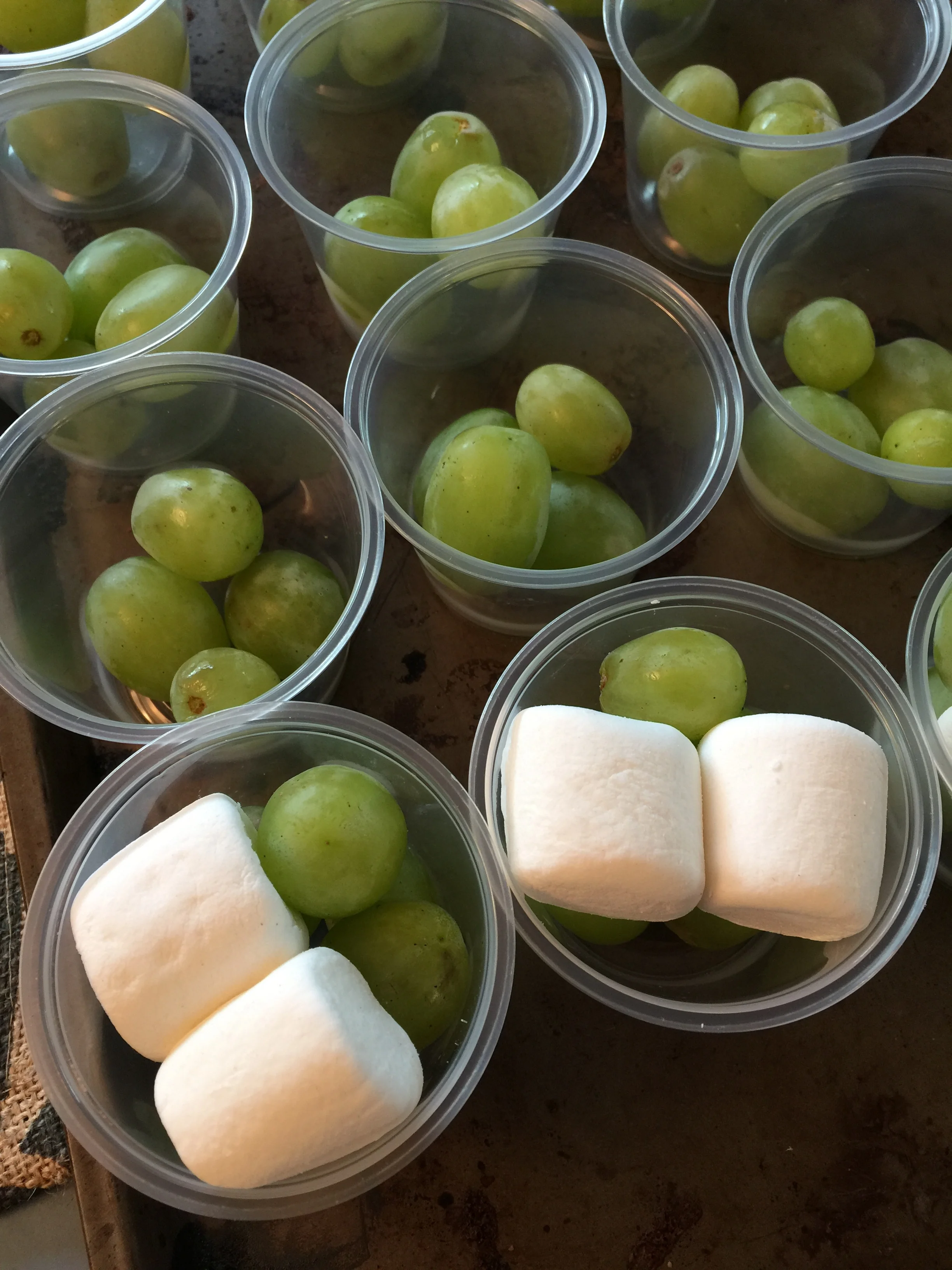 - Add more green grapes to fill up the cup. Make sure the marshmallows are pressed up against one of the sides of the cups.