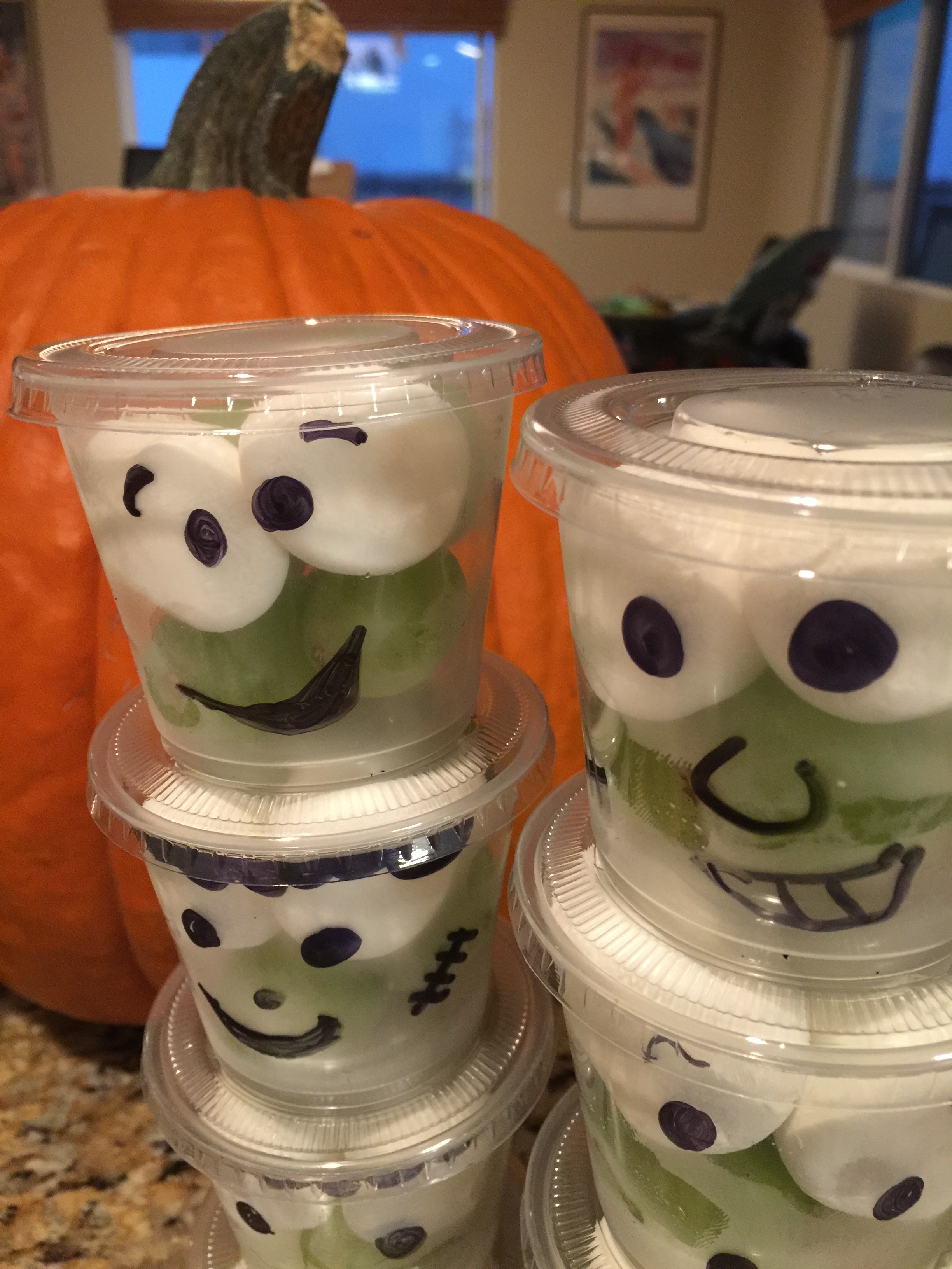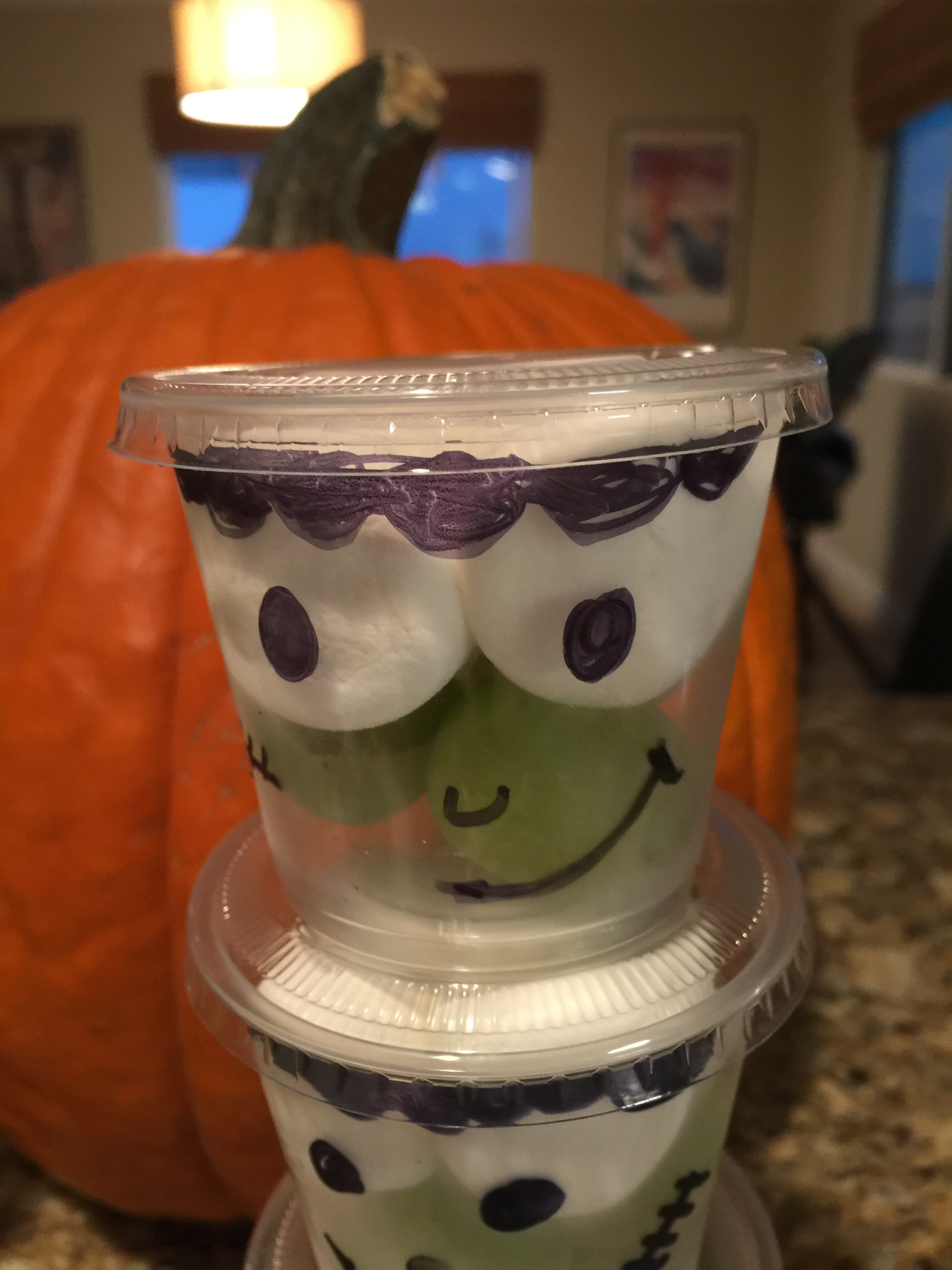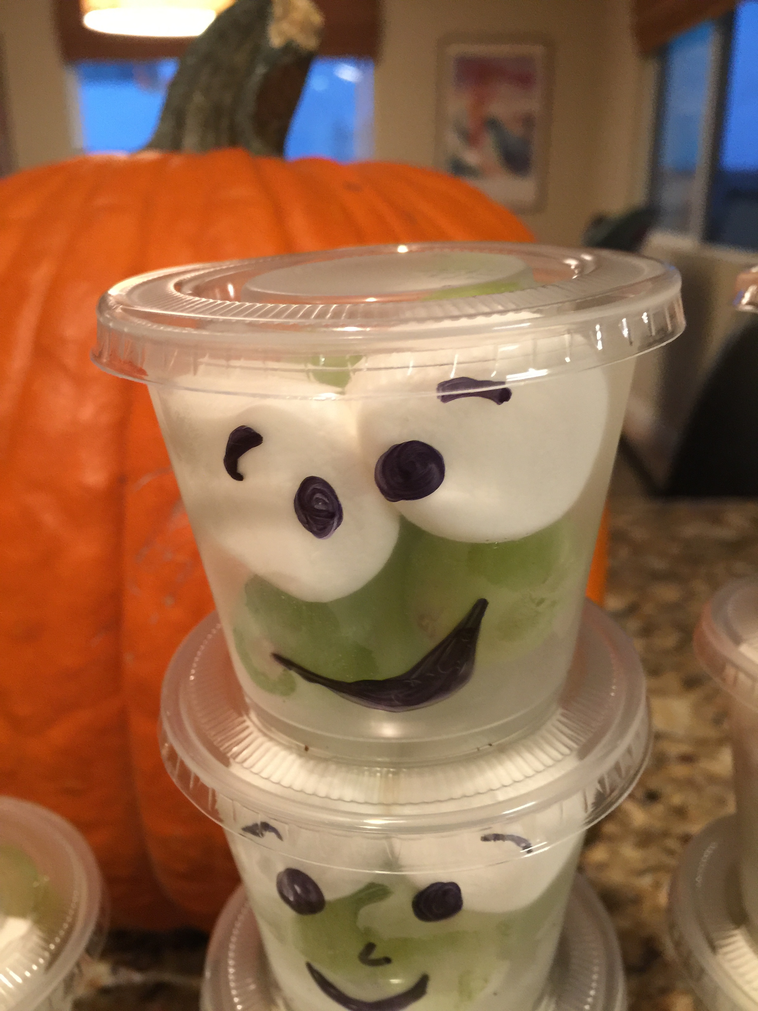 - Draw funny and scary faces on the cups with the Sharpie marker. They don't have to be elaborate, just make sure the pupils of the eyes are over the marshmallows and maybe a smile or mad eyebrows. ;)