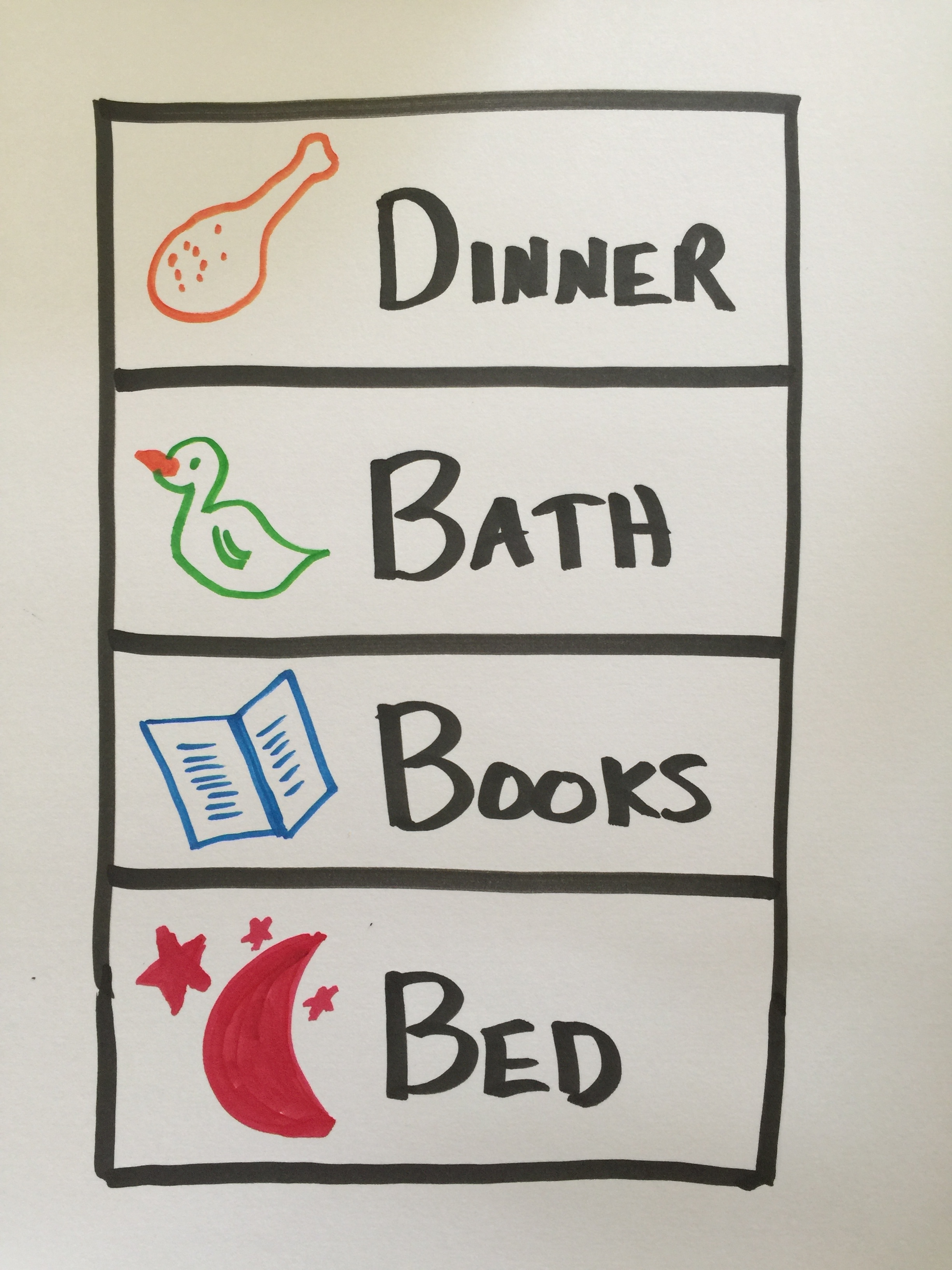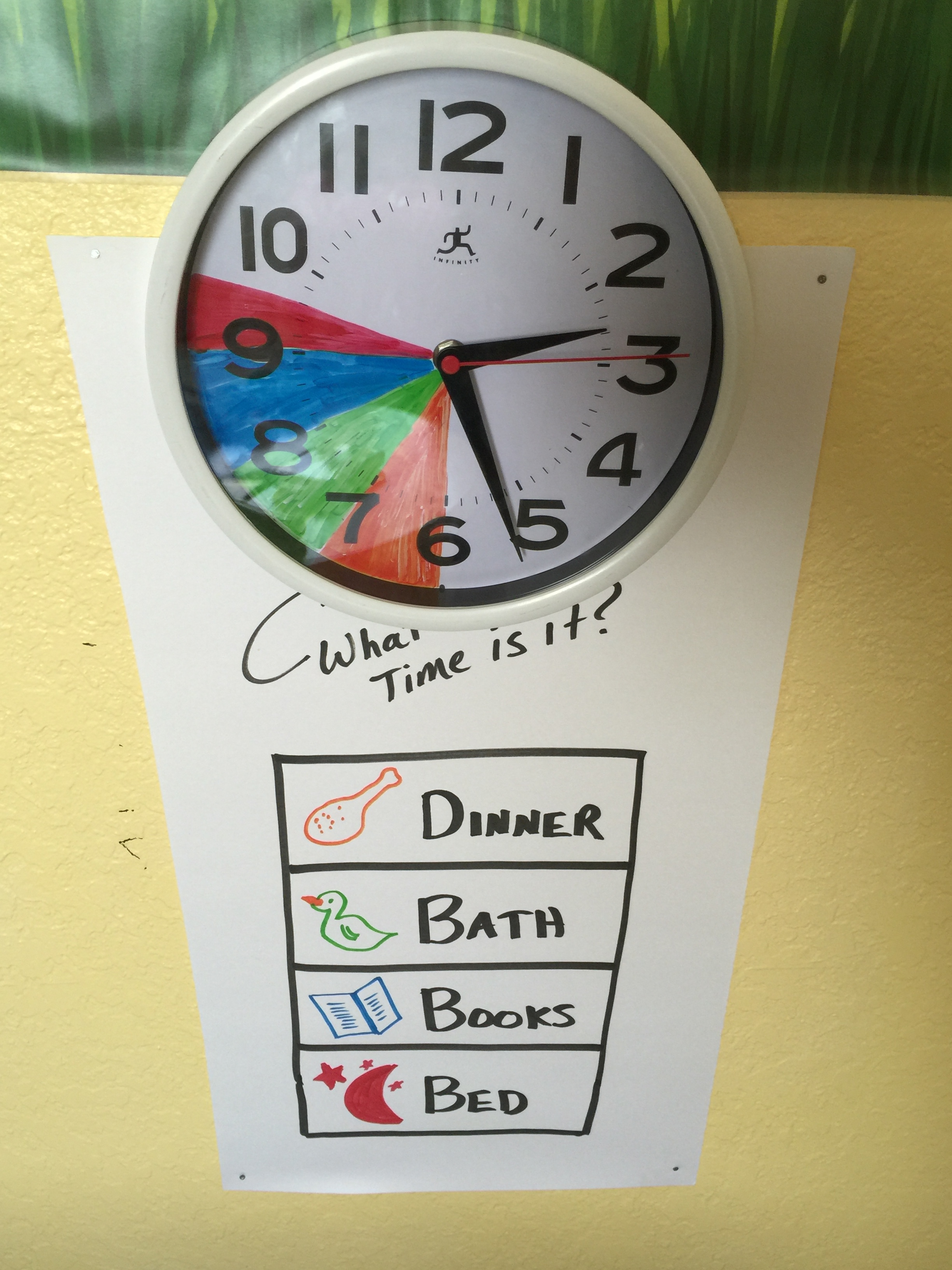 It's not worth the fight. Fighting with your little one about what time it is (time for baths, time for bed, etc) is an endless battle. And what's worse is they can't tell time yet anyway! So they just keep saying 5 more minutes. haha We created this night time clock and colored it so that our toddler knows a little more about what time it "really" is: Dinner, Bath, Books & Bed.