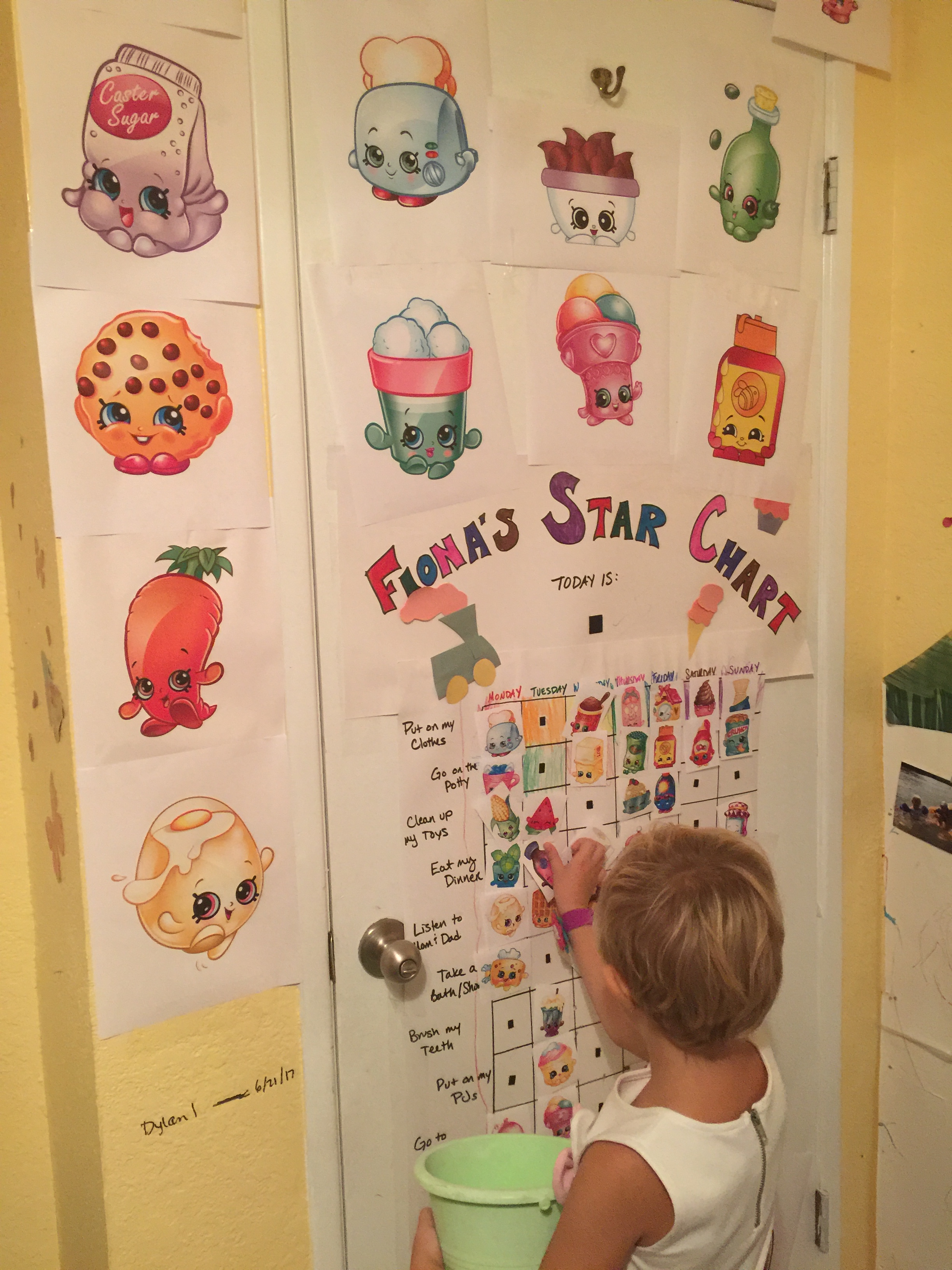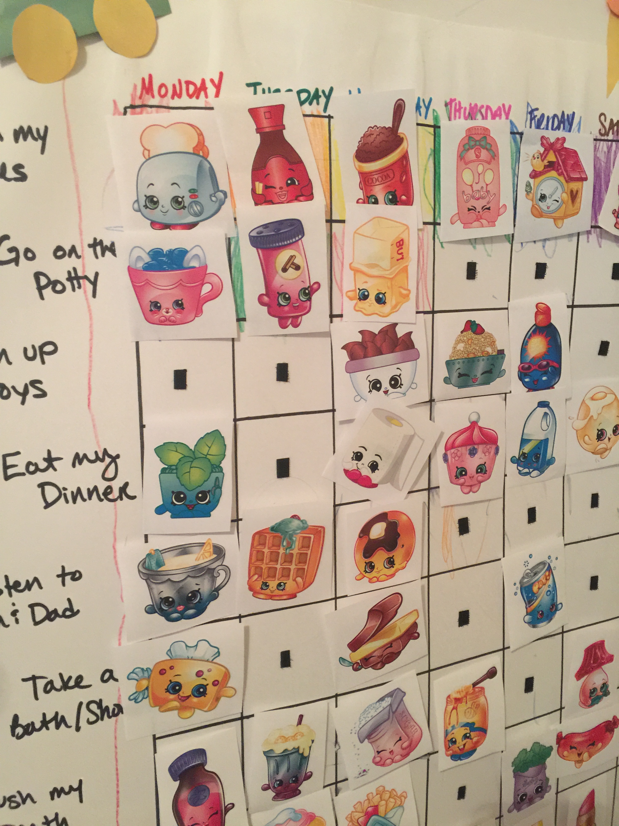 Now that our little girl is a preschooler, helping out around the house is a necessity. And the infamous "star chart" works better than ever at this age - with the smallest reward going a long, long way. A year ago she was more motivated by family activity (like a trip to the zoo or a train ride) as the prize for completing the star chart, but now it's all about Shopkins! So I updated our old star chart with new velcro Shopkins, and voila "we" are listening again. :)